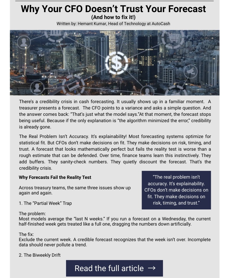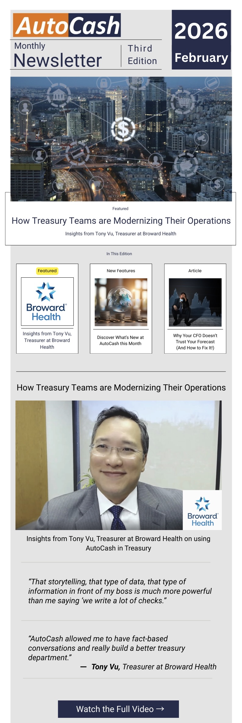 newsletters AutoCash Monthly Newsletter – February 2026 | Treasury Leader Insights | AutoCash Monthly Highlights | Fix Forecast Trust February 9, 2026 Sai Phani No comments yet Sai Phani Post navigation Previous Leave a Reply Cancel replyYour email address will not be published. Required fields are marked *Comment * Name * Email * Website